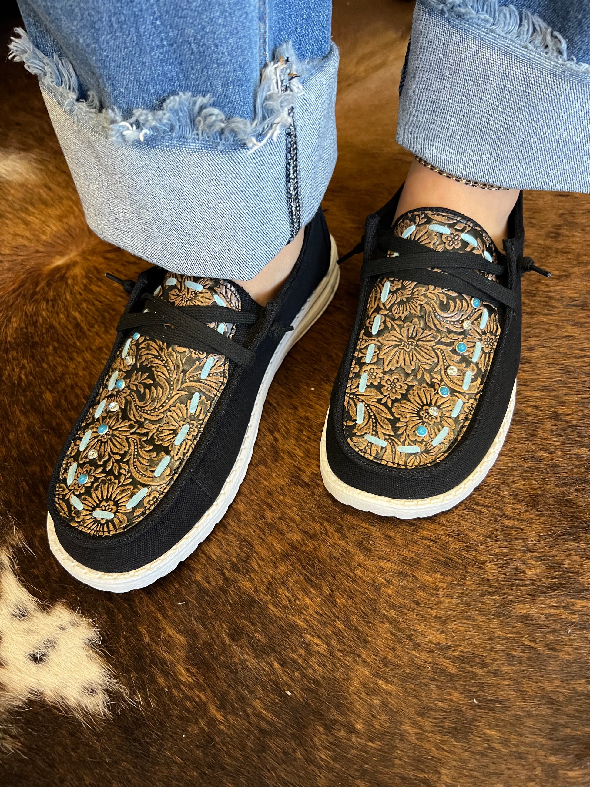 Gypsy Jazz's Vivian Black Slip On Shoes provide a stylish and comfortable way to express your individual style. Crafted from canvas fabric, the shoes feature a tooled top, turquoise bead embellishments, and buck stitch trim, making them a perfect choice for a casual and fashionable look.
