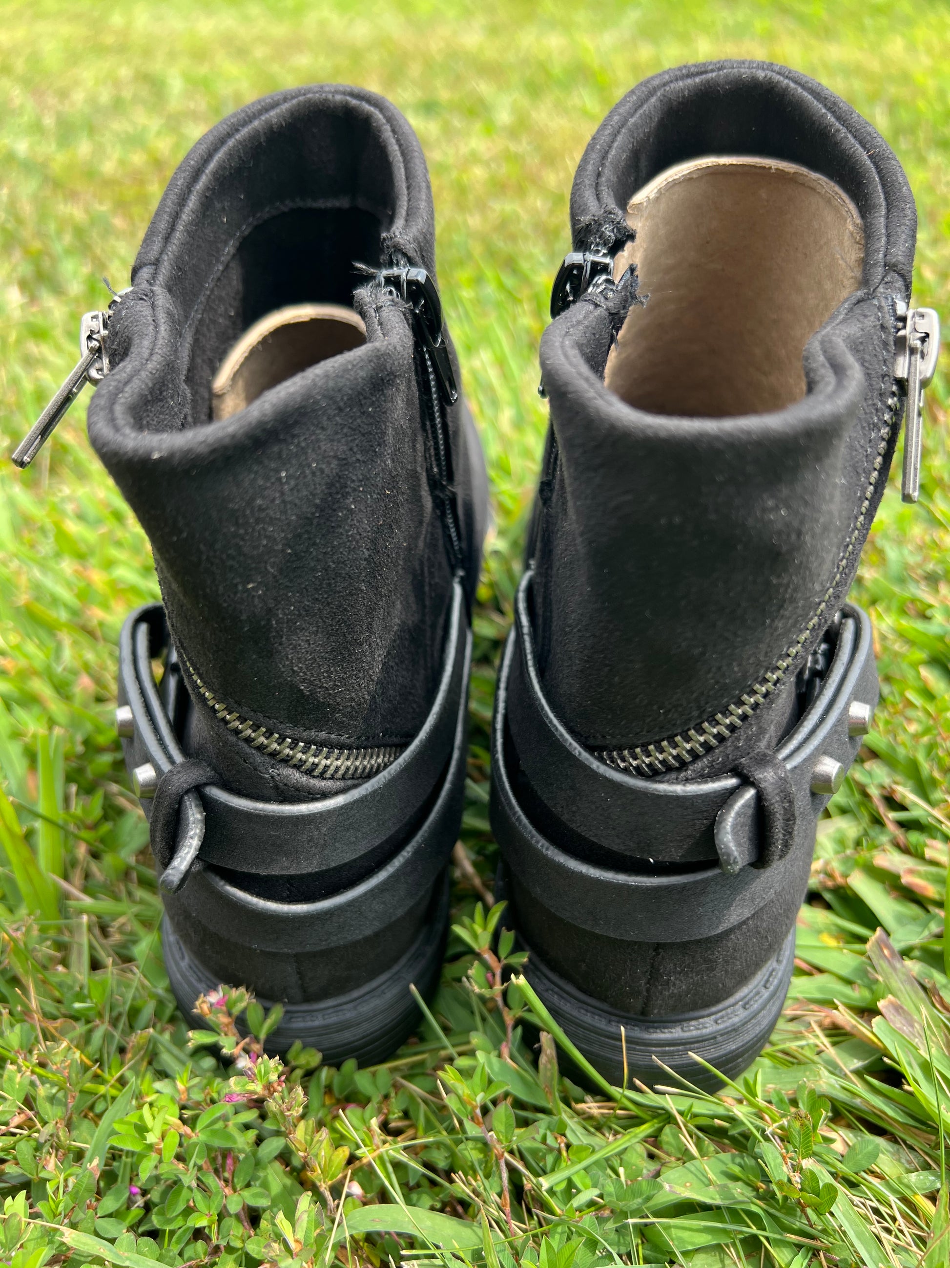 Elevate your fall fashion game with Natasha Short Top Booties by Very G. These stylish boots are both comfortable and chic with a low heel and a fashionable buckle. Featuring faux suede fabric and available in black, these chunky boots are sure to impress. Comfortable too! Fits true to size.